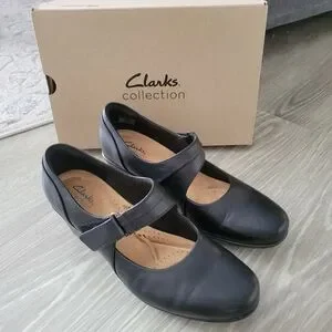 Clarks Women's Black Mary Jane Shoes. Perfect for any occasion, these shoes offer comfort and elegance. Size 8.5 wide fit with comfortable insoles and a modest heel.