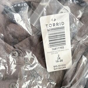 Torrid button down shirt in size 2X featuring a playful gray background with an all-over print of white skulls stars and lightning bolts. This versatile top offers a classic collared neckline and button front closure with a single chest pocket. Perfect for adding a touch of edgy style to your everyday wardrobe.