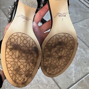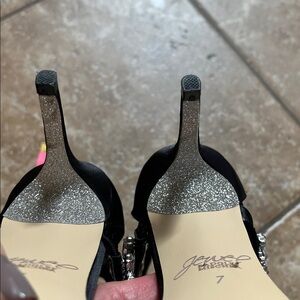 Sexy heels that are relatively comfortable. Heel height is approximately 3 inches. Backs have zippers for ease in putting on. Straps are black satin material. All crystals are intact. Show sign of minimal wear to the outsoles.