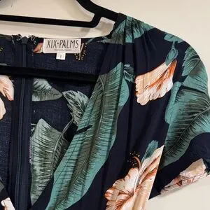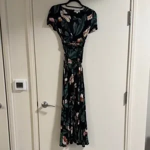 Chic maxi dress with hibiscus floral design. Features a front wrap slit, zip up back and front tie belt and belt loops. Great dress for different events like weddings! Local Honolulu, Hawai’i designer.
