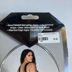 Sheer and stretch lace plus size garter dress with stretch lace trim straps, satin ribbon lace-up back detail and attached stockings.