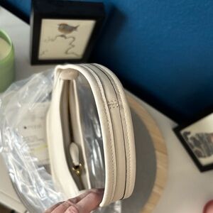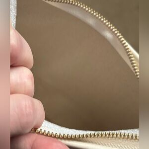 Gold-tone exterior hardware; interior snap pocket