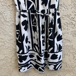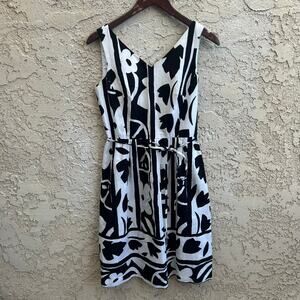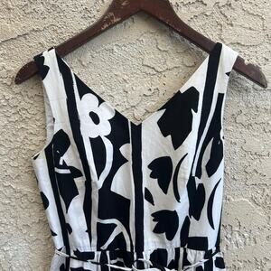 Classic Talbots Petites sleeveless dress with a bold black and white floral print and a flattering V neckline. Lightweight and easy with a defined waist and timeless graphic look that works for spring and summer. Size womens 4 petite.