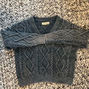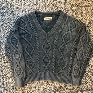 Gorgeous washed blue V-neck sweater with intricate cable knit design. Has a classic distressed look. Perfect for layering and keeping warm for winter. 100%cotton in excellent condition.
