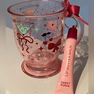 Charming pink cocktail glass with festive designs. Comes with a sweet guava lip butter balm.