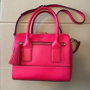 Kate Spade Southport Avenue Alessa bag in pink! This bag measures 9" in height, 10.5" in length, and it has a 4.5" strap drop. It also has a longer removable strap. The interior has a zip pocket and two multifunctional pockets. There is also a zip pocket on the front of the bag. It does have some discoloration of the leather on the back handle and a few other marks shown. It’s still a great looking bag and a great size. It can fit so much