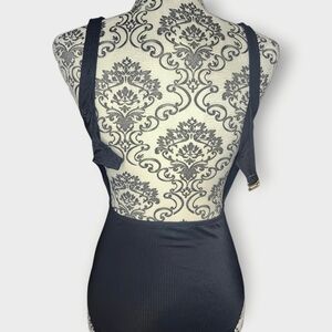 Stylish black one-piece swimsuit with a front and back cutout design. Small peekabo tie-up at chest. Perfect for beach days.