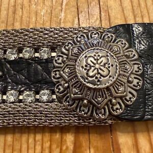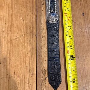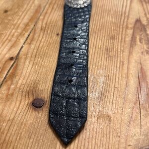 Mammi black crocodile embossed 80 rhinestones concho western belt made in Italy. It has silver tone hardware, metal mesh edge trim, teardrop studs & floral concho medallions. This is a showstopper piece quite substantial. No missing stones EUC
