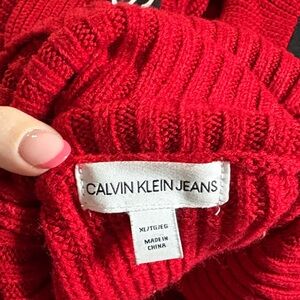 Bold red knit sweater with Calvin Klein Jeans logo on black stripes. Modern and chic.