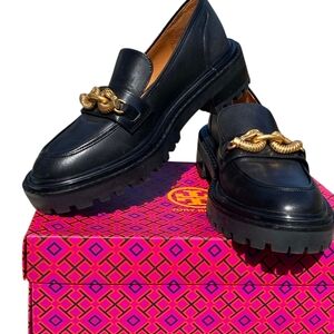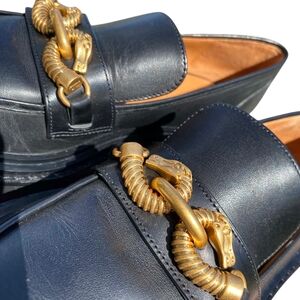 They are a classic black leather slip-on style featuring a chunky lug sole and exaggerated, linked gold-tone horse-head hardware across the vamp