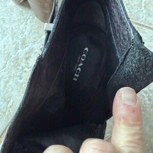 Well cared for Coach ankle booties. Inside of boot has had some cracking. See pic for details. That’s the only flaw. Outside… no flaws. Beautiful boots.