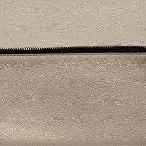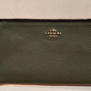 Chic olive and ivory leather wristlet by Coach. Features a gold-tone double zip closure. 8”x4.5”.