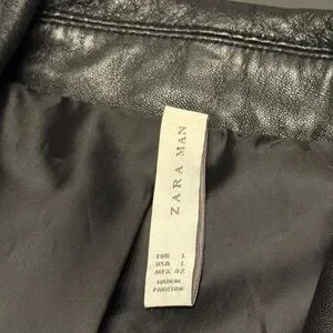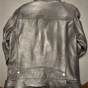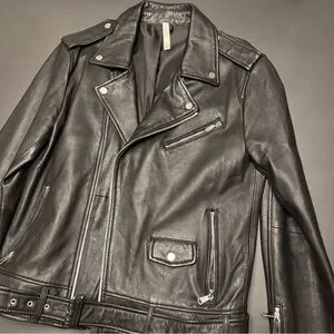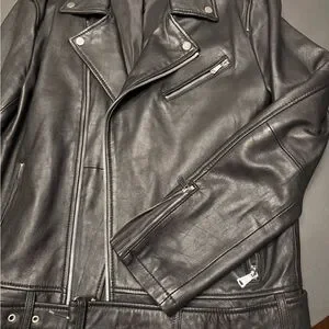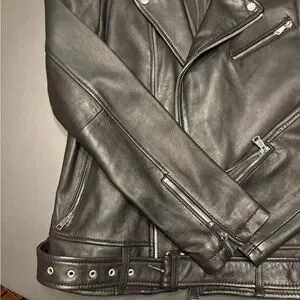 Stylish black leather jacket with a classic moto design. Features zippered pockets and a sleek finish.