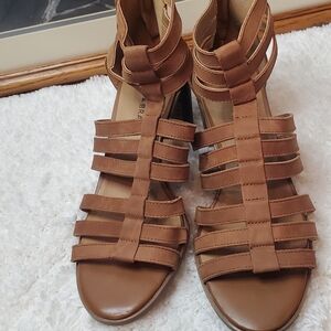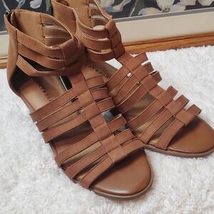 Step out in style with these chic brown strappy sandals from Lucky Brand with zip back. Perfect for any occasion, these sandals offer both comfort and elegance. Display only, never worn.