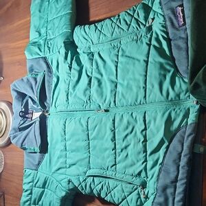 Aqua quilted jacket by Patagonia. Features full zip and warm design.