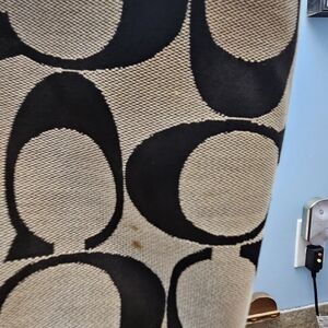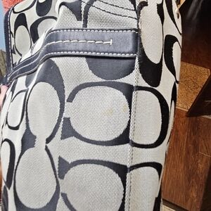 Stylish Coach tote bag in black and cream. Perfect for everyday use with a spacious interior. NOTE. Well loved Coach purse, couple of stains that may wash out. Pictures show the imperfections, price reflects.