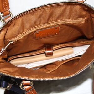 Exterior: 1 rear zip pocket, 1 front zip pocket, leather logo plaque, leather trim with burned edge finish