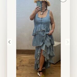 I love this dress so much. It's made of soft, lightweight denim layers that drape perfectly over the body. The ruffles are so pretty and feminine. Ties at the back. Buttons on the front work. Side slit. This is the perfect dress. Sadly, I forgot I had this and now I can't wear it.
