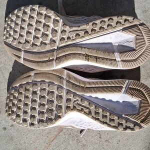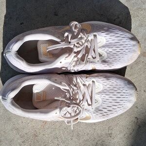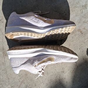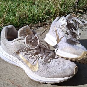 Elevate your style with Nike's beige/white athletic running shoes. Gold accents add a touch of elegance. Perfect for active days.
