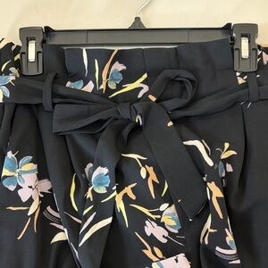 These high waist flowy pants are in excellent like new condition, only worn a few times! Washed in cold and line dried. They are black with an abstract floral design (purple, blue, tan and cream). Size Large (12-14). I am 5'8" and they hit me below the ankle, perfect to wear with flats or a small heel. Elastic waist, belt loops and matching tie belt.