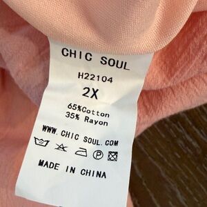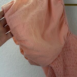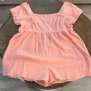 Chic Soul Peach Puff Sleeve Smocked Back Gauze Romper 2X. The color is light peach. It appears darker in my pictures than it actually is. Pictures lying flat best reflects the true color. Measurements taken flat/ approximate: chest armpit to armpit 23” unstretched and can stretch to about 25”, waist 21” and can stretch to about 22”, inseam 3”, length 33”. Smoke free home. Weighs 10 ounces for shipping.