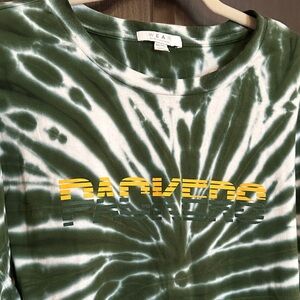 Stylish green tie-dye long sleeve shirt with bold yellow lettering. Perfect for casual wear.