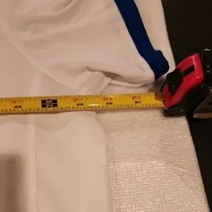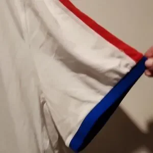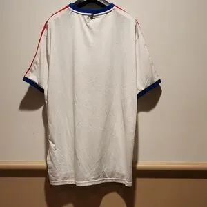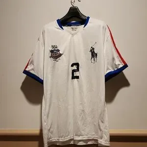 Classic white jersey sport tee with bold blue and red trim. Features signature logo and number detail. Polo Sport. No spots