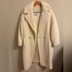 Iconic Max Mara Teddy Bear coat in a beautiful white shade. Ultra-cozy, timeless, and effortlessly chic—this is the statement coat that never goes out of style. Worn only 2 times, in excellent condition with no flaws. Made from Max Mara’s signature plush blend, this coat is incredibly warm yet lightweight, with a soft, luxurious feel. Details: Size: Small Color: White Condition: Excellent, no flaws Worn: 2 times Teddy Bear Icon style Cozy, warm, and elegant Fabric: 62% Alpaca 26% Virgin Wool 12% Silk Lining: 100% Viscose A true investment piece and a winter wardrobe staple 🤍