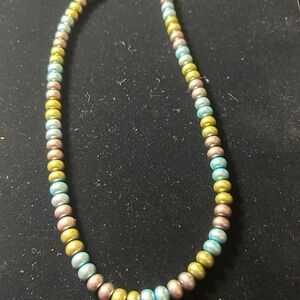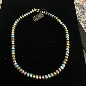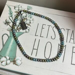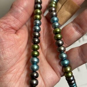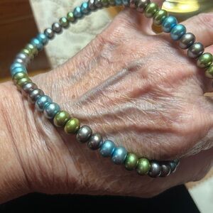 Hannora genuine freshwater Rondell Pearl necklace is 18 inch. Beautiful with shades of blue green, teal and bronze pearls. Stunning! never worn. sterling silver clasp.
