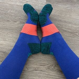 Experience comfort and style with these bright colored crew socks from Bombas. Featuring hex Tex technology and a vibrant blue and orange design, these socks are perfect for running without worry of blisters or discomfort. Great used condition!