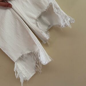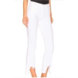Elevate your denim collection with these chic Mother Superior The Dutchie Ankle Jaws high-rise jeans in the classic "Almost Innocent" white wash. These straight-leg jeans feature a unique, raw, and distressed "chewed" hem that hits at the ankle, adding a touch of edginess to the sophisticated style