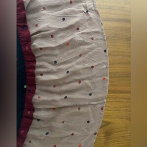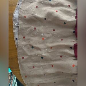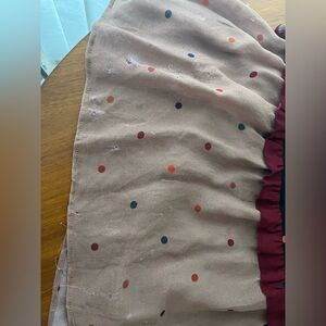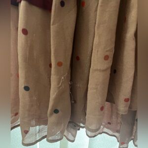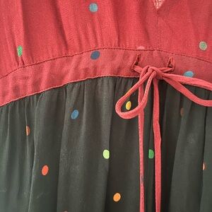Fun and elegant FARM Rio maxi dress with burgundy, black, and tan tiers with colorful small polka dots. V cut neckline works well on its own or with something styled underneath. Lots of sheer fabric for a beautiful and full swing. Feels great to wear. Bottom tier has some damage as shown in pictures, there is wear on both front and back. I don’t think it’s noticeable to the look when wearing because it’s so close to the ground and there is so much fabric gathered.