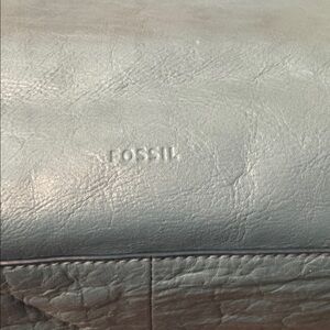 FOSSIL Rachel Large Leather Tote With Zipper Light Blue Brown Handles Brass Trim