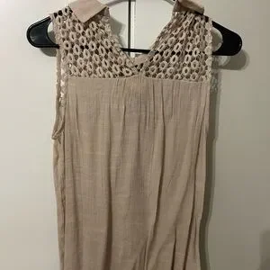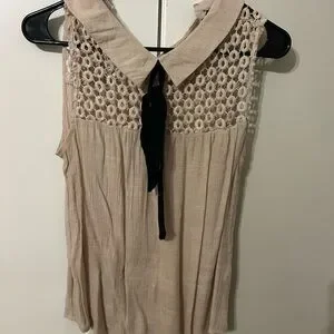 Chic beige blouse with lace yoke. Features a stylish black tie accent. Perfect for casual elegance.