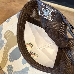 Stylish camo trucker hat with duck embroidery. Features brown mesh back. Perfect for outdoor adventures.