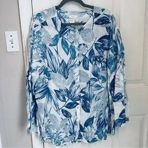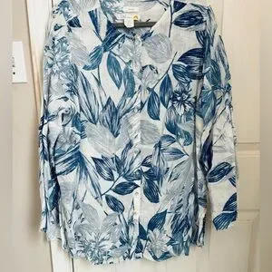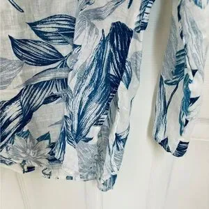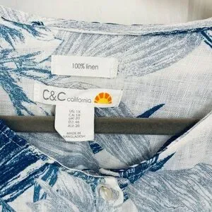 EUC, no stains, holes, or obvious signs of wear. Women’s size 1x from C&C California. Color is white with blue tropical leaf print. Button front with 3/4 sleeve and split hem. Lightweight, 100% linen.