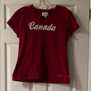 Vibrant red tee with 'Canada' print. Soft fabric. Ideal for casual wear.