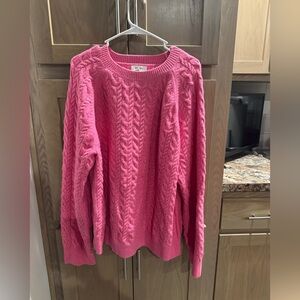 Bright pink sweater with classic cable knit design. Ideal for layering and casual wear.