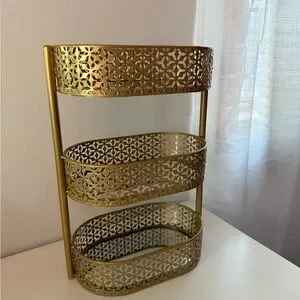 Elegant gold metal organizer with three tiers. Perfect for storing small items.