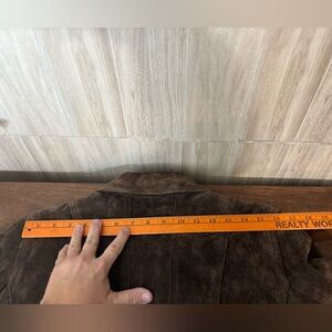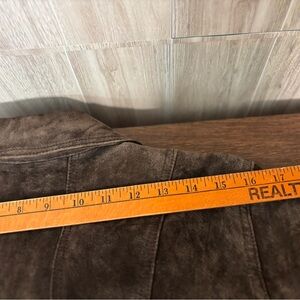 Upgrade your wardrobe with this timeless brown leather suede jacket. Its sleek design offers both style and comfort for any occasion. In very good condition. See photos for measurements.