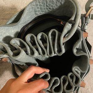 Beautiful stylish gray pebbled leather bag. Features drawstring closure. Includes dual handles. Two compartment areas. Rose gold hardware. Worn once and in excellent condition. Reposhing item and did not come with a dust bag, but will provide a different one instead.