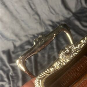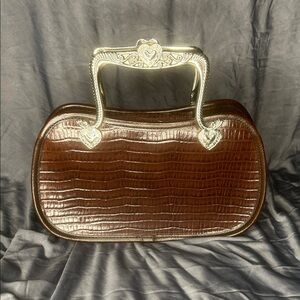 Small croc-embossed leather handbag with silver tone heart detailing. Some scratches on the metal straps and other general wear and tear, but in good condition. See photos for wear.