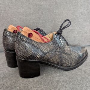 Gorgeous Office of Angela Scott leather lace-up oxfords. Iridescent snake print leather. The mid height block heel is the perfect silhouette - high enough to feel dressy while comfortable enough to wear all day. These are size 36.5 but I believe they run a little small for this style.