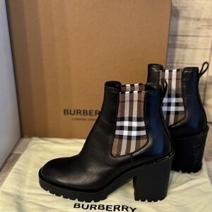 Step out in style with these Burberry black leather ankle boots. Featuring the iconic Burberry check pattern, these boots offer both elegance and comfort. Perfect for any occasion.