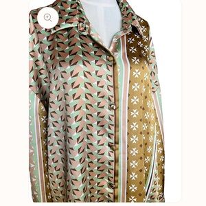 Chic blouse by House of Harlow 1960. Features geometric patterns in brown, cream, and pink. Almost in perfect condition, worn once! Has minimal pulling in 2 spots that can be easily trimmed and fixed. Super soft and comfortable!