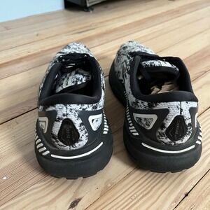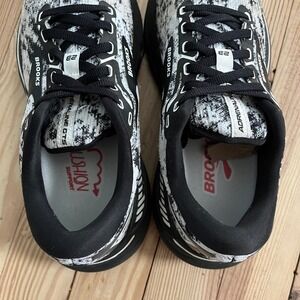 Brooks Adrenaline GTS 23 running shoes in a striking black and white abstract pattern. Designed for comfort and support, these athletic shoes feature a secure lace-up closure and a durable outsole. Ideal for everyday runs, training sessions, or active casual wear. Some brownish areas that may need extra cleaning.
