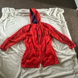 Bold red utility jacket with a hood. Snap button closure and practical pockets. Perfect for everyday wear.