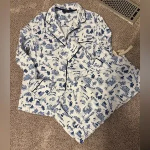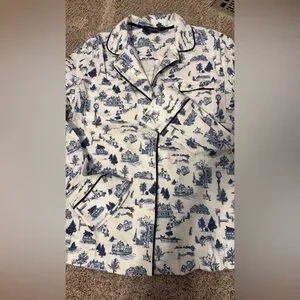 Charming pajama set with scenic blue and white print. Features elegant black trim. Tags off, never worn