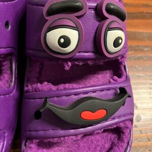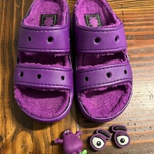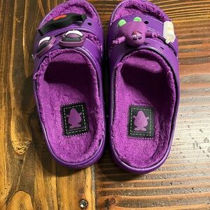 Bright purple furlined croc slides with playful character details. Barely worn! Size is men’s 5 women’s 7