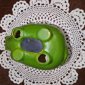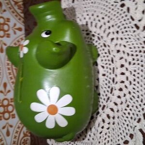 Charming green piggy bank featuring a delightful floral design. Perfect for adding a touch of whimsy to your home decor. 3" tall 6" long.
